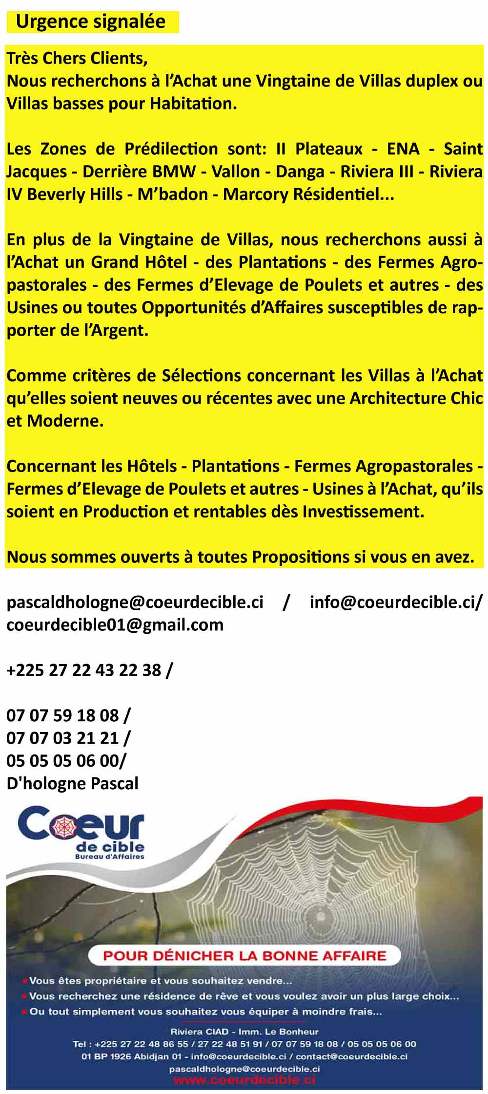 pascaldhologne@coeurdecible.ci / info@coeurdecible.ci/ coeurdecible01@gmail.com